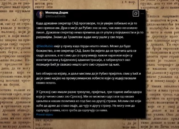 Nakon što je državni sekretar SAD-a Marco Rubio označio Milorada Dodika kao nekog ko ugrožava stabilnost BiH nakon čega je prilično jasno da se gase snovi o podršci SAD-a za separatističke ciljeve kao i težnje da će se pojedini političari skinuti sa crnih lista ove zemlje, počele su i objave Milorada Dodika u njegovom maniru.