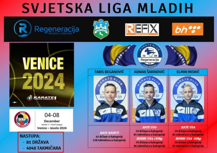 Karate klub Regeneracija ponosno najavljuje da će od 4. do 8. decembra, tri njihova talentirana natjecatelja predstavljati klub na prestižnoj Svjetskoj Ligi Mladih u Veneciji, Italija. Ovaj važan međunarodni događaj okupit će takmičare iz cijelog svijeta, jer će se takmičiti u konkurenciji najboljih mladih karatista iz čak 81 države, a ukupno 4048 sportaša iz svih kontinenata.