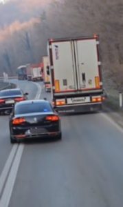 Na društvenim mrežama osvanula je snimka koja prikazuje zabrinjavajuću situaciju na cestama Bosne i Hercegovine. Dva službena automobila, Audi i Volkswagen Passat, u pratnji rotirajućih svjetala, preticala su tri kamiona u opasnoj krivini, prelazeći duplu punu liniju.