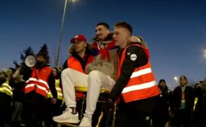 Među studentima je bio i Aleksandar koji je pješačio sa štakama, a kojeg su okupljeni u jednom trenutku ponijeli te spustili na stolicu omotanu zlatnom folijom.