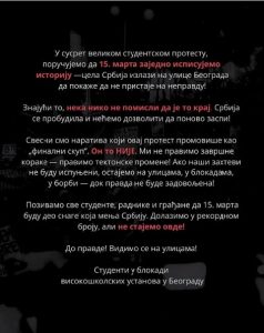 „On to nije. Mi ne pravimo završne korake – pravimo tektonske promene. Ako naši zahtevi ne budu ispunjeni, ostajemo na ulicama, u blokadama, u borbi – dok pravda ne bude zadovoljena. Pozivamo sve studente, radnike i građane da 15. marta budu deo snage koja menja Srbiju. Dolazimo u rekordnom broju, ali ne stajemo ovde. Do pravde! Vidimo se na ulicama!“, navode u svom saopštenju Studenti u blokadi.