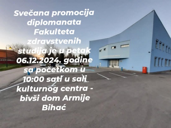 U petak, 6. decembra 2024. godine, u Bihaću će se održati svečana promocija 28. generacije diplomanata Fakulteta zdravstvenih studija Univerziteta u Bihaću. Ovaj značajan događaj bit će održan s početkom u 10:00 sati u sali Kulturnog centra, u bivšem domu Armije Bihać.