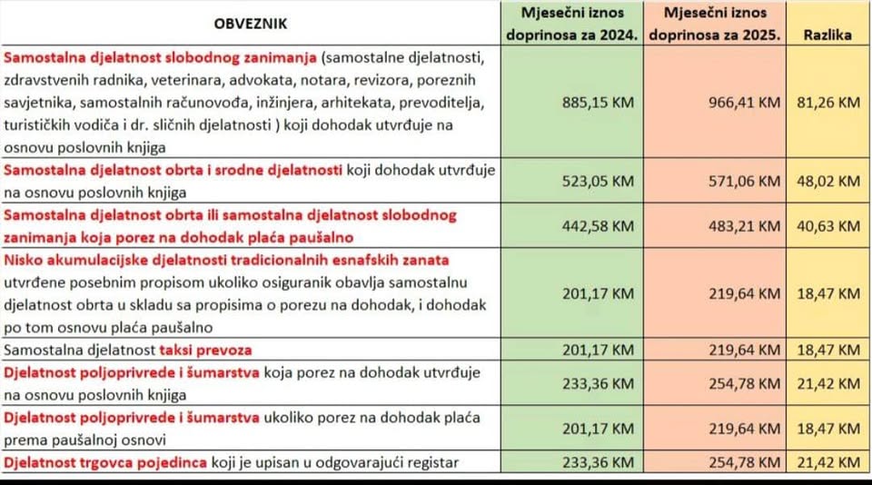 ¨Svim vlasnicima obrta, tj. svima u FBiH koji samostalno obavljaju delatnost ( prema tabeli u prilogu), doprinosi su vezani za prosečnu platu iz prethodne godine i ovo su novi iznosi (objavljeno na sajtu Poreske uprave FBiH)